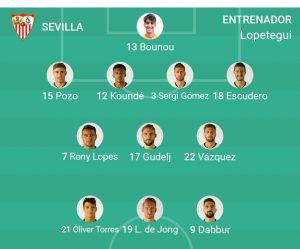 Vaclík – Jesús Navas, Sergi Gómez, Diego Carlos, Reguilón – Fernando, Óliver Torres, Franco Vázquez – Ocampos, Nolito, De Jong.