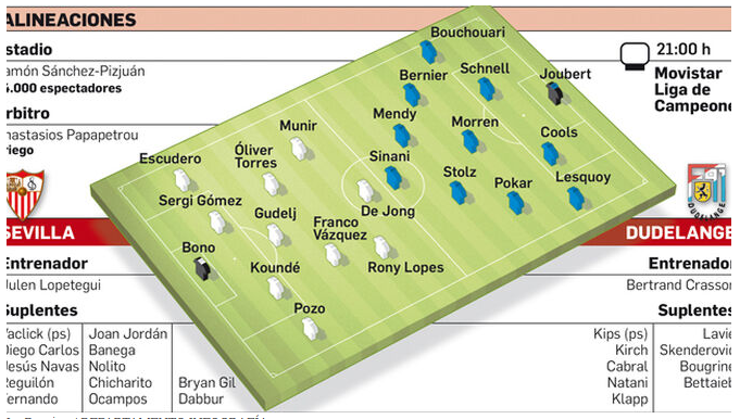 Vaclík – Jesús Navas, Sergi Gómez, Diego Carlos, Escudero – Fernando, Banega, Óliver Torres – Ocampos, Nolito, De Jong.