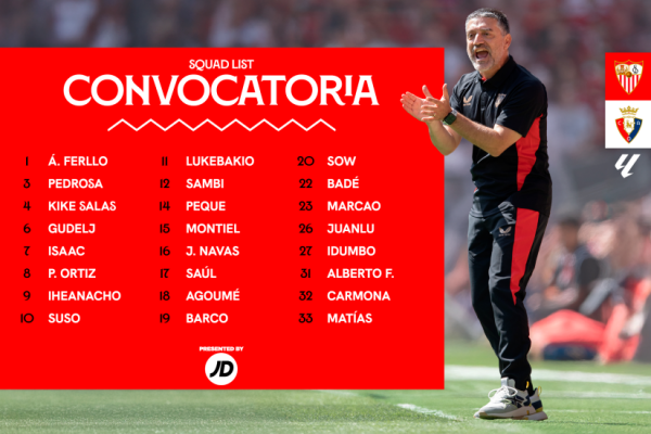 Esta es la lista completa de García Pimienta: Álvaro Ferllo, Alberto Flores, Matías, Jesús Navas, Carmona, Juanlu, Montiel, Kike Salas, Badé, Marcao, Pedrosa, Barco, Gudelj, Saúl, Lokonga, Agoumé, Pedro Ortiz, Sow, Suso, Lukebakio, Peque, Idumbo, Iheanacho e Isaac.
