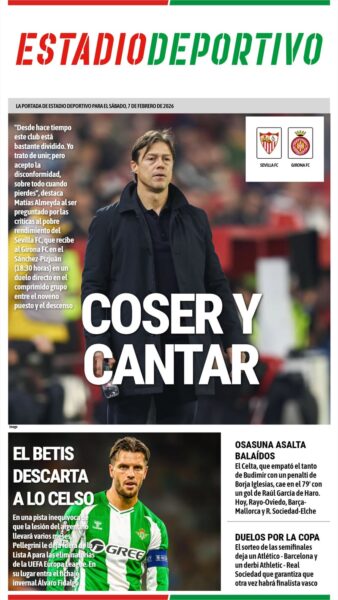 Coser y cantar: «Desde hace tiempo este club está bastante dividido. Yo trato de unir; pero acepto la disconformidad, sobre todo cuando pierdes. No te van a tirar flores», destaca Matías Almeyda al ser preguntado por las críticas al pobre rendimiento del Sevilla FC, que recibe al Girona FC en el Ramón Sánchez-Pizjuán en un duelo directo en el comprimido grupo entre el noveno puesto de la clasificación y el descenso.