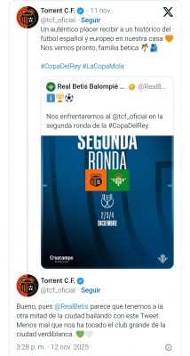 El CM del Torrent responde con un tweet provocador a los sevillistas, que estallan contra la publicación: «Bueno, pues @RealBetis parece que tenemos a la otra mitad de la ciudad bailando con este tweet. Menos mal que nos ha tocado el club grande de la ciudad verdiblanca».