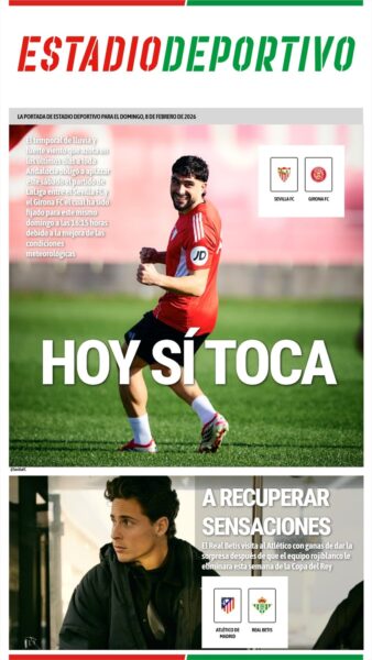 En este domingo, la primera página del rotativo está dedicada al partido que hoy sí finalmente se jugará entre el Sevilla FC y el Girona CF.