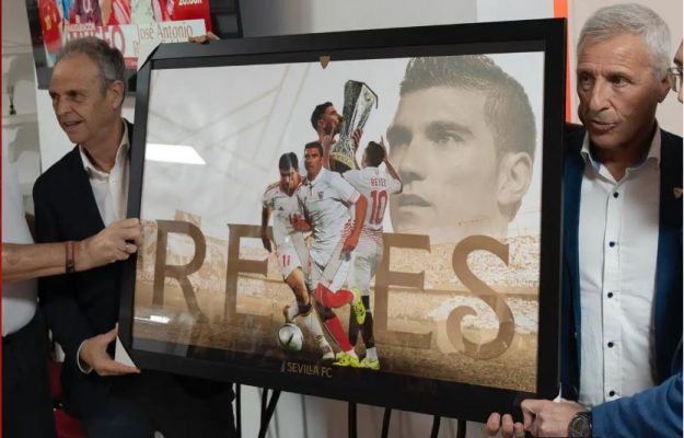 El sencillo acto, celebrado en la propia peña sevillista, contó con la presencia de dos figuras del club muy vinculadas a Reyes, como son Joaquín Caparrós, presidente de honor del club, y el embajador, Pablo Blanco.