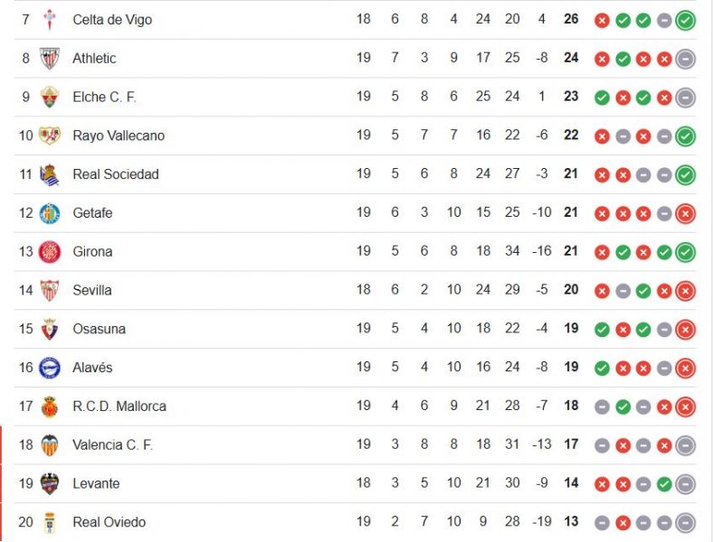 Ahora ese puesto lo ocupa el Valencia CF con 17 puntos, a sólo tres de los andaluces, que ya son decimocuartos en la tabla con 20 puntos y un partido menos.