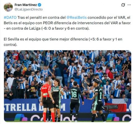 Así, según la información que desvela Fran Martínez @LaLigaenDirecto, el Betis es el equipo con pero diferencia de intervenciones del VAR a favor menos en contra de LaLiga, con (-6). Por contra, el Sevilla es el equipo que tiene una diferencia positiva mayor, con (+5).