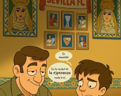 Aprovechando esta circunstancia, el Sevilla FC ha publicado una viñeta que se ha hecho rápidamente viral, donde mezcla el partido de mañana ante el Barça, con las dos Esperanzas de Sevilla.