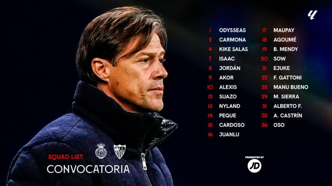 Con estas variantes, el «Pelado» intentará confeccionar un once competitivo que mantenga la solidez mostrada en los últimos encuentros. La lista definitiva la componen: Odysseas, Nyland, Alberto Flores, Juanlu, Carmona, Castrín, Gattoni, Cardoso, Kike Salas, Suazo, Oso, Agoumé, Mendy, Sow, Jordán, Manu Bueno, Ejuke, Miguel Sierra, Peque, Alexis, Isaac Romero, Akor Adams y Neal Maupay.