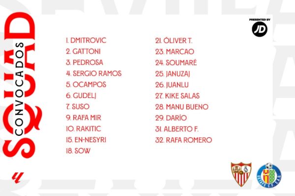 Así, la lista completa de los 21 convocados la conforman: Dmitrovic, Alberto Flores, Rafa Romero, Juanlu, Darío, Gattoni, Sergio Ramos, Marcao, Kike Salas, Pedrosa, Gudelj, Soumaré, Manu Bueno, Sow, Rakitic, Óliver Torres, Januzaj, Ocampos, Suso, Rafa Mir y En-Nesyri.