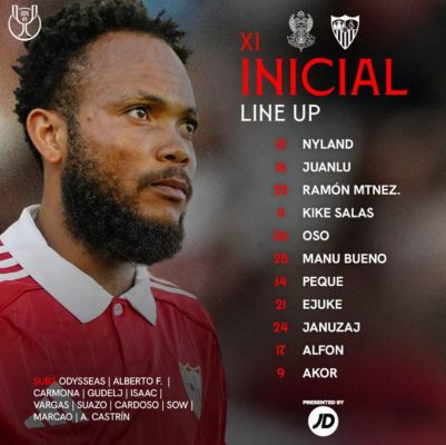 El once con el que saltará el Sevilla FC estará compuesto por Nyland; Juanlu, Ramón Martínez, Kike Salas, Oso; Manu Bueno, Peque; Ejuke, Januzaj, Alfon; Akor.