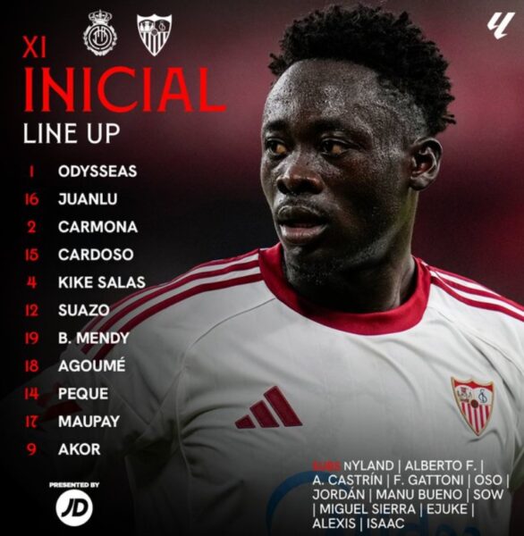 El once inicial de Matías Almeyda estará compuesto por Odysseas, Juanlu, Carmona, Cardoso, Kike Salas, Suazo, Mendy, Agoumé, Peque, Maupay y Akor.