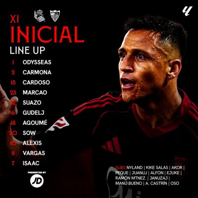 El once del Sevilla FC que ha dispuesto Matías Almeyda estará formado por Odysseas, Carmona, Cardoso, Marcao, Suazo, Gudelj, Agoumé, Sow, Vargas, Alexis e Isaac.
