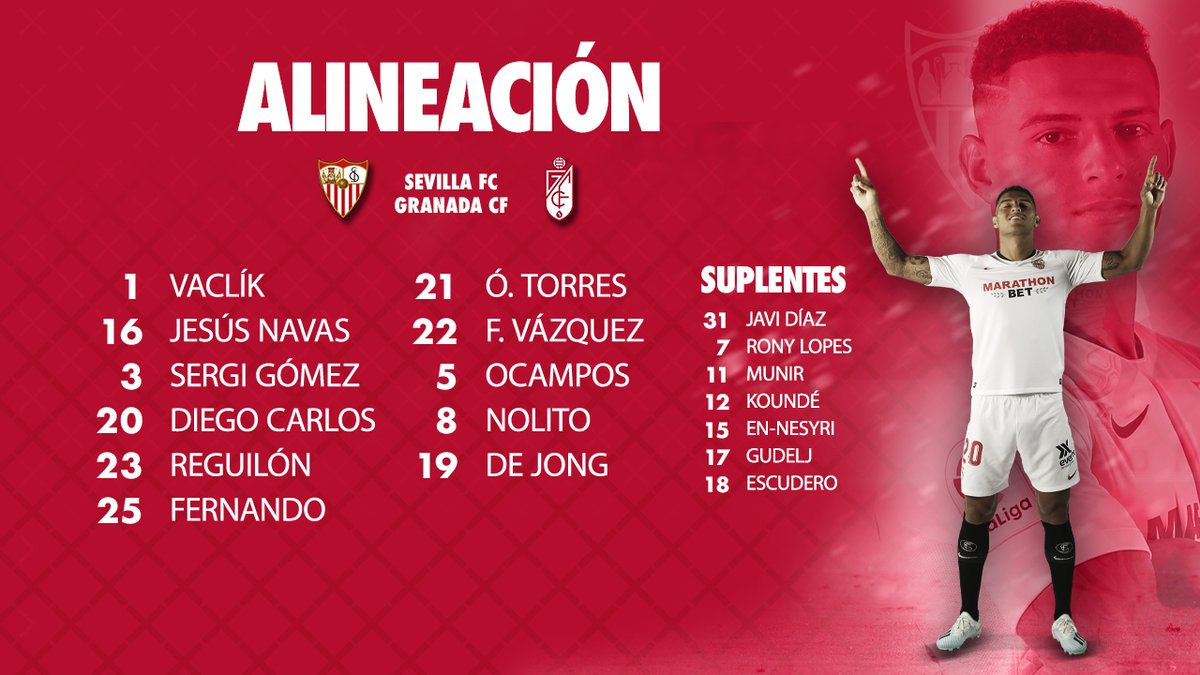 Once del Sevilla FC contra el Granada 25 enero, 2020 por Toni Sánchez Once del Sevilla FC contra el Granada CF: Vaclík – Jesús Navas, Sergi Gómez, Diego Carlos, Reguilón – Fernando, Óliver Torres, Franco Vázquez – Ocampos, Nolito, De Jong. Comparte por Whatsapp esta noticia