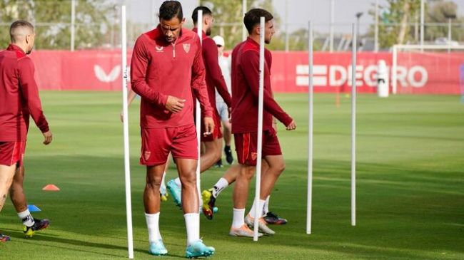 🦑🇧🇷⚪🔴El susto de Fernando en el entrenamiento del #SevillaFC tras caer al suelo después de un salto en el que perdió la estabilidad en un rondo. Finalmente, el brasileño siguió entrenando al mismo ritmo que sus compañeros pic.twitter.com/quwSKxklXa