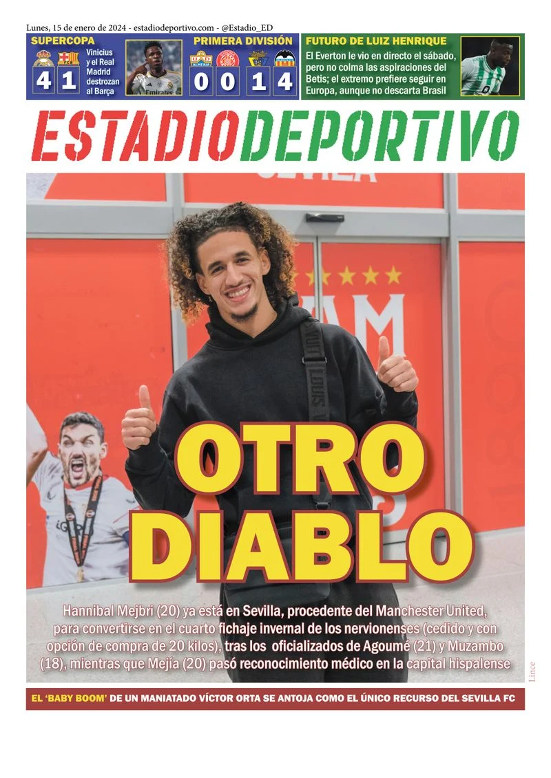 En este lunes, la primera página del rotativo hace referencia a la llegada a nuestra ciudad del último fichaje del Sevilla FC en este mercado de invierno, Hannibal Mejbri.