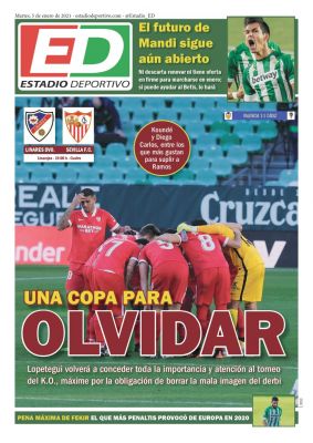 Portada ED – Una Copa para olvidar y Koundé o Diego Carlos por Ramos 5 enero, 2021 por EstadioDeportivo UNA COPA PARA OLVIDAR: Lopetegui volverá a conceder toda la importancia y atención al torneo del K.O., máxime por la obligación de borrar la mala imagen del derbi Koundé y Diego Carlos entre los que más gustan para suplir a Sergio Ramos. Comparte por Whatsapp esta noticia