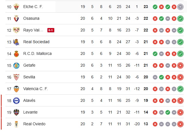 Alavés (18º): Marca el descenso con 19 puntos tras su derrota ante el Atlético de Madrid.