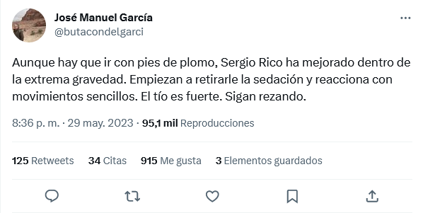 Según informa el periodista José Manuel García, poco a poco le están retirando la sedación y Sergio reacciona con movimientos sencillos a los estímulos.