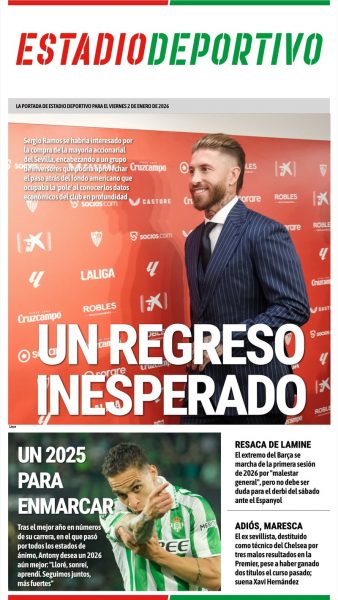 En este viernes, segundo día del año, la primera página del rotativo está dedicada a la posible vuelta del Sergio Ramos, esta vez para ser propietario del club.